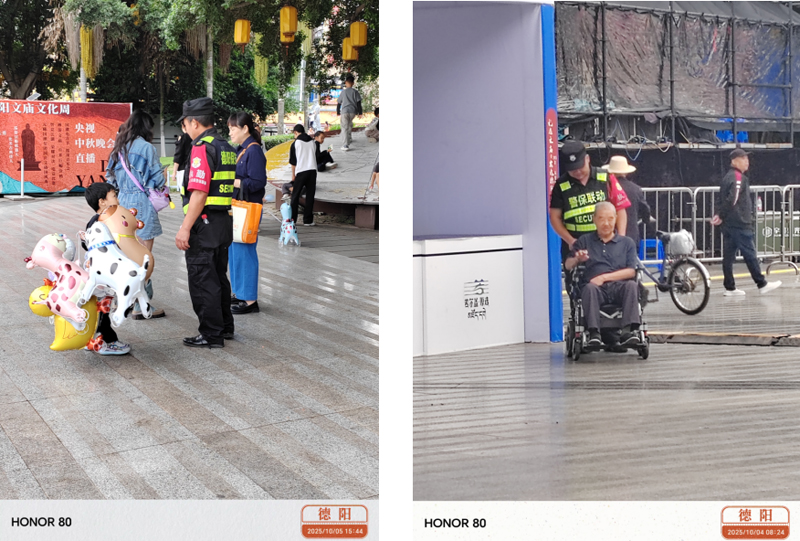 溫情服務,柔性守護:安保工作并非只有鐵面無私,更充滿了人文關懷。文廟廣場活動現場,一名與家人走散的小男孩在安保人員的悉心照料下,通過廣播系統很快找到了父母;也有老人忽感身體不適,執勤隊員第一時間發現并聯系醫療點,提供了及時的幫助。這些溫暖的瞬間,讓嚴肅的安保工作充滿了溫度,贏得了德陽市民的廣泛贊譽。